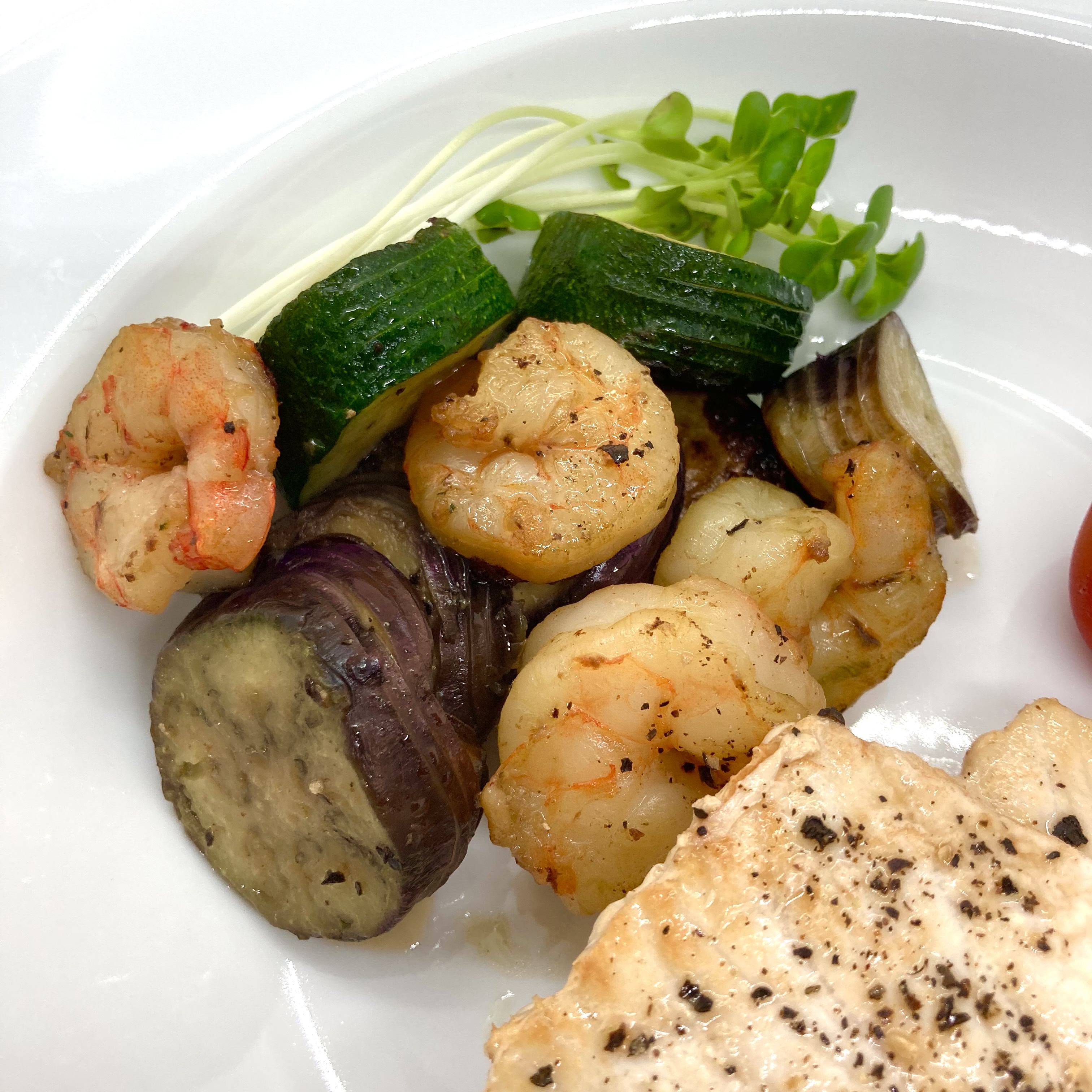 - フライパンに油をひいて海老とナスとズッキーニをさっと炒める。