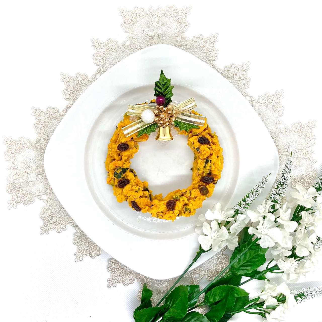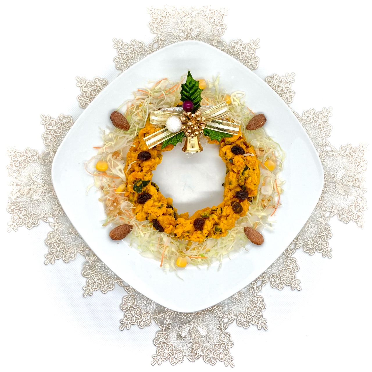 今回は、盛り付けに製菓用の乾燥レーズン、お皿の余白にはキャベツと人参の千切りサラダ、素焼きのアーモンド、リースのセンター部分にはケーキのデコレーションを装飾しました。