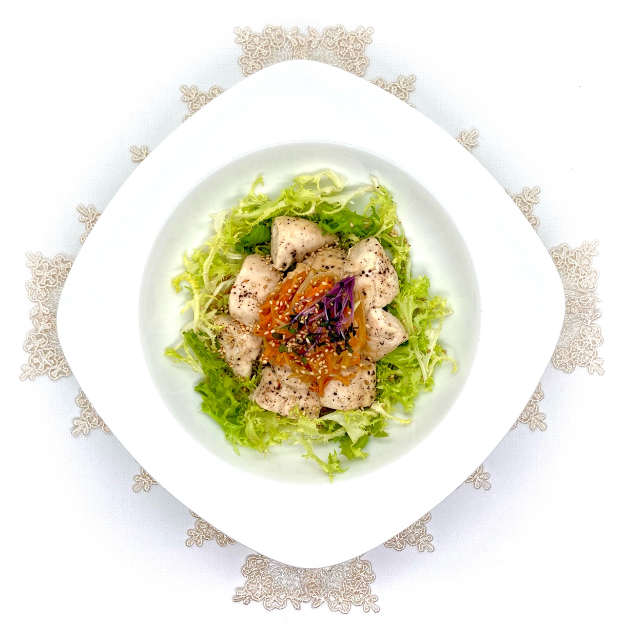 トッピングに白胡麻・エンダイブ・レッドキャベツのスプラウトを使用しました。