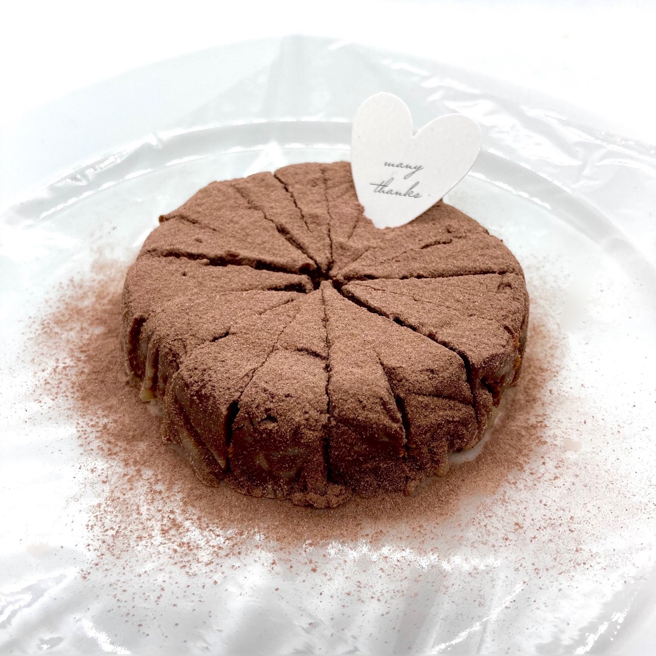 - 3時間後にサランラップごと型から外して、お湯で包丁を温めながら切る。包丁についたチョコを拭きながら切ると綺麗に切れる